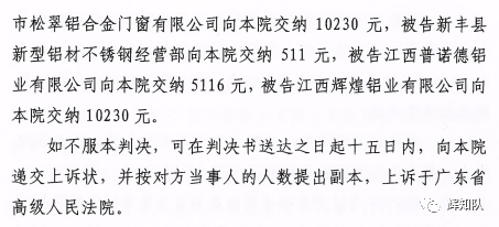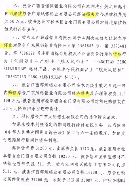 赣州凤铝系列维权案:诉辉煌公司等四被告,法院判赔250余万